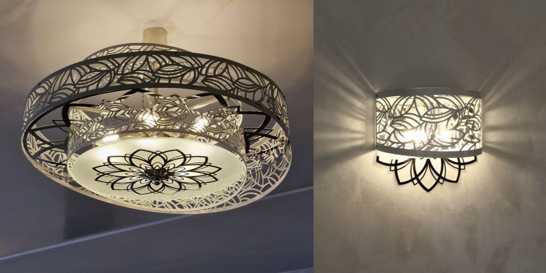 Let's begin in the spacious living room, seamlessly connected to the modern kitchen. This airy space is refined to absolute perfection, including the ceilings, which exude luxury thanks to a glossy Venetian plaster finish. To complete the look, the ceilings are crowned with three elegant lights featuring perforated metal shades inspired by the lotus flower. These lights are crafted from metal with a white finish and adorned with a golden floral accent that covers a frosted glass plate.