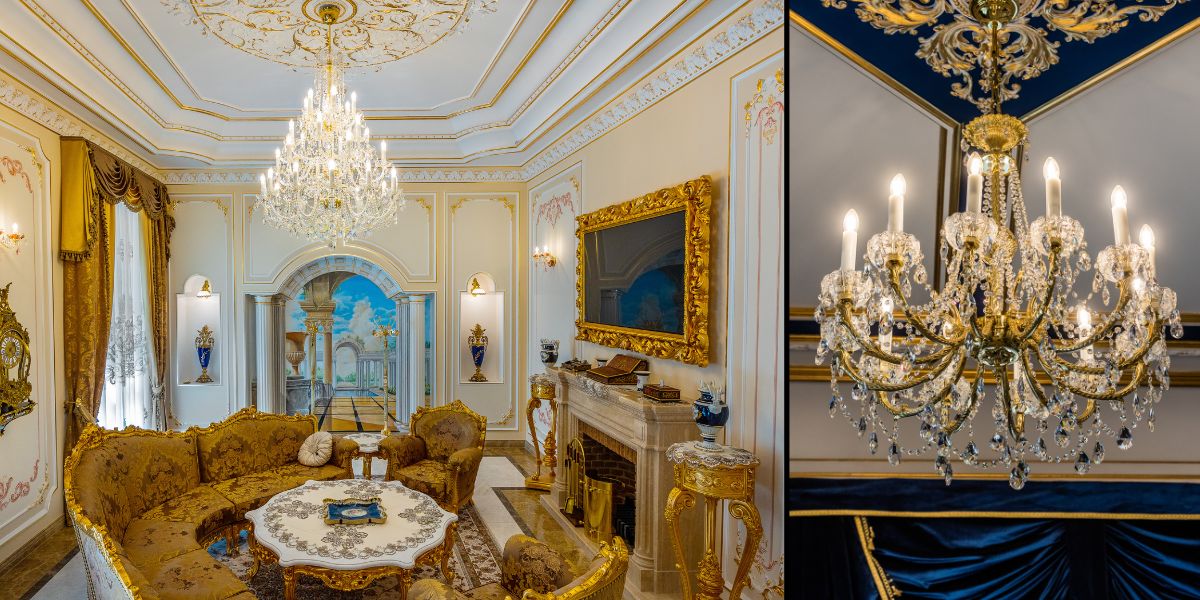 Another example is Śliwniki Château in Poland, which, after years of neglect, has been beautifully restored. The focal point of its grand hall is a Marie Theresa chandelier, an imposing 2.5-meter-tall fixture weighing 400 kg and featuring 72 light bulbs. Its installation took two days, but the result is breathtaking—this shimmering chandelier has become the true crown jewel of the château.