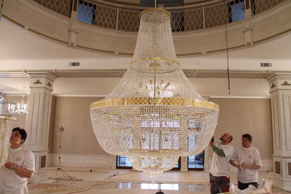 Busko-Zdrój is one of Poland's best spa resorts, whose greatest wealth is its water containing sulphur, iodine and bromide. The main hall of one of the spa houses was decorated with our impressive pear-shaped ceiling light with 68 bulbs and a height of over 3 metres. The entire space is complemented by 32 glass chandeliers and several spiral ceiling lights.