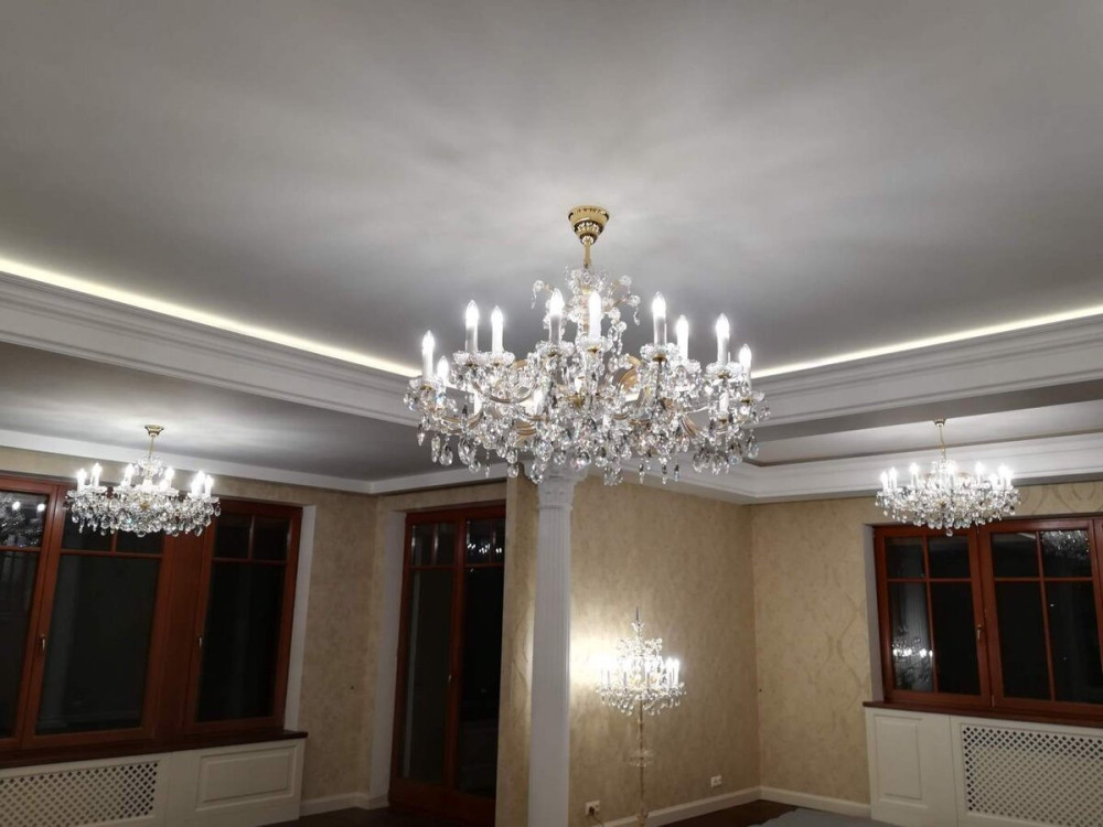 In the renovated villa in Warsaw (PL), the whole spectrum of the types of luminaires we sell has found its application. In the main living area we installed crystal chandeliers of the "Maria Theresa" type. A glass crystal chandelier found its place in the dining room. In the corridors and staircases there are small crystal crystal chandeliers. In the homeowner's study, a cast brass chandelier adds to the stylish furnishings.