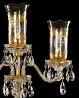 Crystal table lamp with three bulbs is decorated with colored glass bowls, vases and other central parts, and special vases - so-called tulips - around bulbs. All these parts are produced with use of high enamel technology. For the decoration of these parts, 24K gold is applied – both on the surface coverage and fine decoration of many subtle details. Each piece is an original and represents hours of careful handwork. Cut crystal trimmings underline the beauty of the lamp. This ceiling light especially stands out in historically furnished and carefully color-tuned interior.