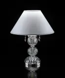 The small table lamp has a leg composed of lead crystal parts with the trademark BOHEMIA CZECH REPUBLIC - LEAD CRYSTAL OVER 24% PbO. It is decorated with cut crystal trimmings. The white textile lampshade is decorated with two textile bands with metallic glitter. The lamp is suitable for living room and bedroom.