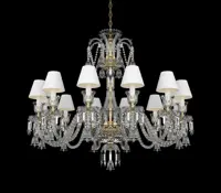 The large Baccarat-style ceiling light with twelve bulbs can become a beautiful dominant of representative, luxurious interiors with high ceilings. The chandelier is decorated with many beautiful details, such as interestingly formed bowls, decorative glass bells and trimmings in the shape of richly cut prisms. The light of the bulbs is softened by white textile lampshades.