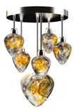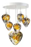 This modern luminaire is designed to not only illuminate but also inspire. Its circular metal base is smooth and elegant, but what really catches the eye are the drop-shaped glass light fixtures that are fixed at different heights. An innovative method of processing the glass allows for a fascinating blend of colours, making each piece unique.