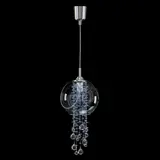 The basis of this modern and very effective chandelier is a perfectly smooth glass sphere with a diameter of 20 cm with carved holes, in which the light bulb is placed. The main decorative element is the wires with cut Czech crystal trimmings, which are hung in this sphere and surround the light bulb. These trimmings can be clear or colored to match the style of your interior. The light of the light bulb, which passes through these trimmings, is refracted into beautiful rainbow and light reflections. We offer the lamp in a silver finish. Read more